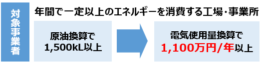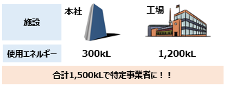 また工場や施設が複数ある場合、合算のエネルギー使用量で特定事業者かどうか決まります