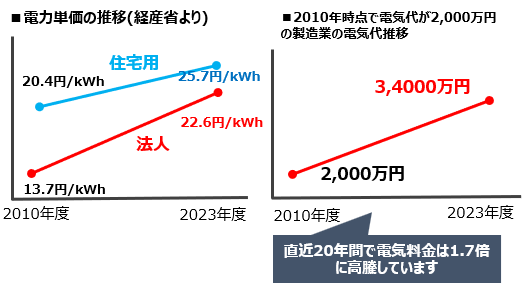 過去10年間で電気料金単価は9円/kWh高騰をしています